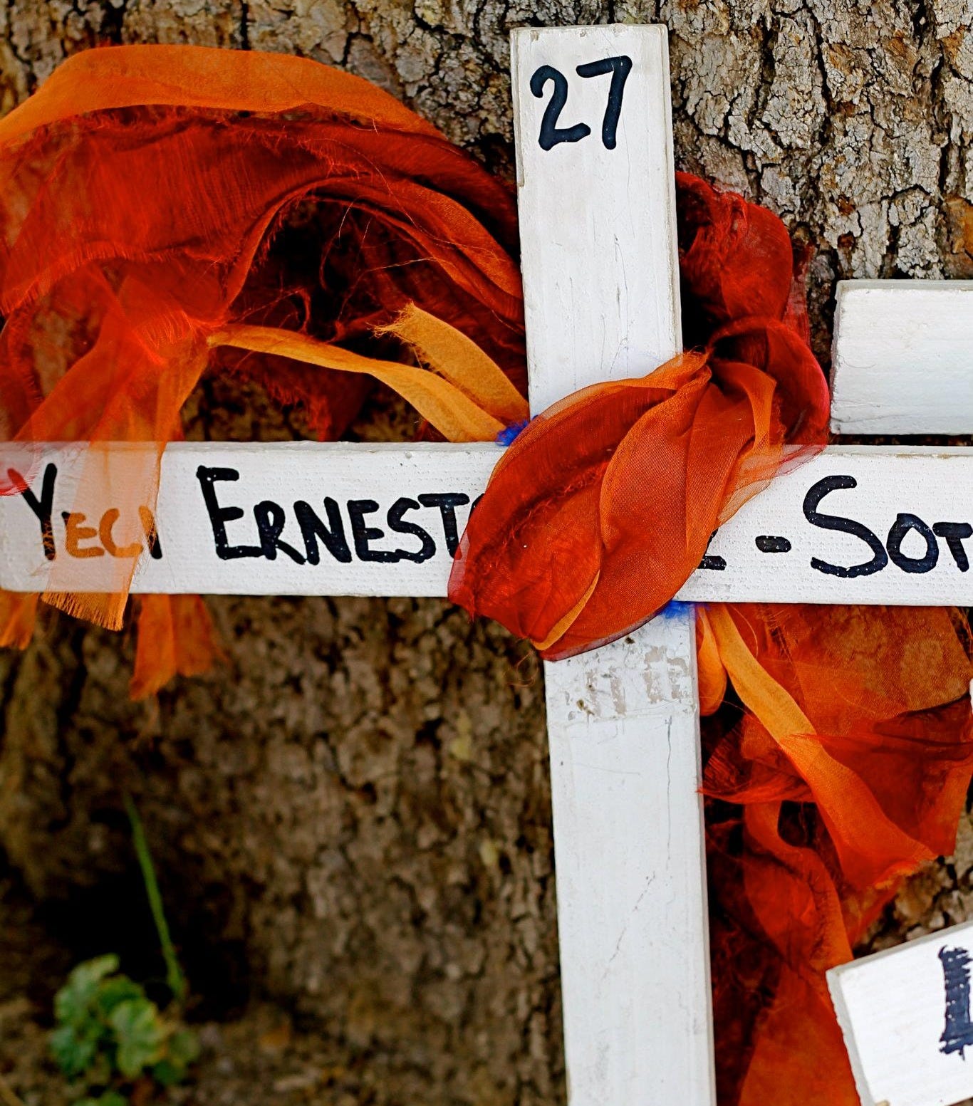 Each participant is given a cross with a name and the age of a missing or dead migrant. Many of them are simply “desconocida/o” (unknown), denoting migrant bodies that are unidentifiable. Once we reached Tucson, we placed them one by one against a tree, saying each of their names.